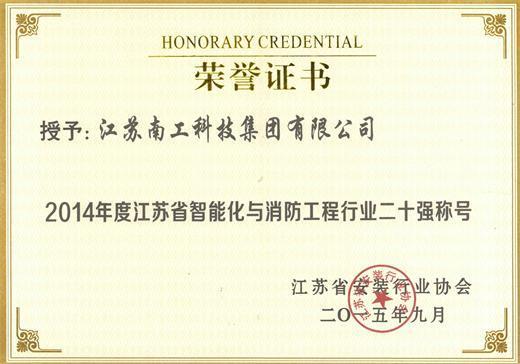 2015年12月18日,江蘇省安裝行業(yè)協(xié)會(huì)智能化與消防工程分會(huì)一屆三次會(huì)員代表暨江蘇省智能建筑高層論壇在南京召開。在本次會(huì)議上集團(tuán)榮獲江蘇省安裝行業(yè)協(xié)會(huì)頒發(fā)的《2014年江蘇省智能化與消防工程行業(yè)二十強(qiáng)》稱號。