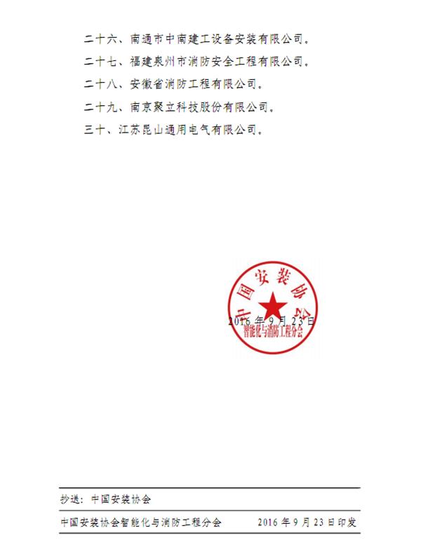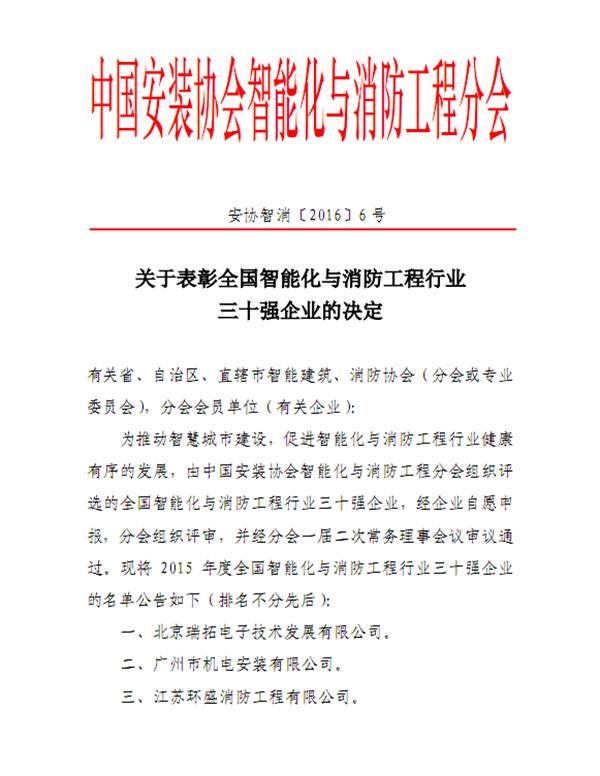 2016年9月23日,由中國(guó)安裝協(xié)會(huì)智能化與消防工程分會(huì)組織評(píng)選的“全國(guó)智能化與消防工程行業(yè)三十強(qiáng)”企業(yè)名單正式公布,集團(tuán)榮獲了“全國(guó)智能化與消防工程行業(yè)三十強(qiáng)”企業(yè)的殊榮。