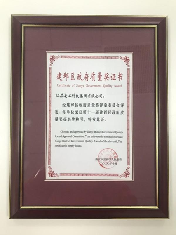 建鄴區(qū)政府質(zhì)量獎證書