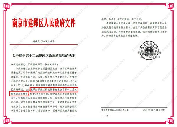 關(guān)于授予第十二屆建鄴區(qū)政府質(zhì)量獎決定